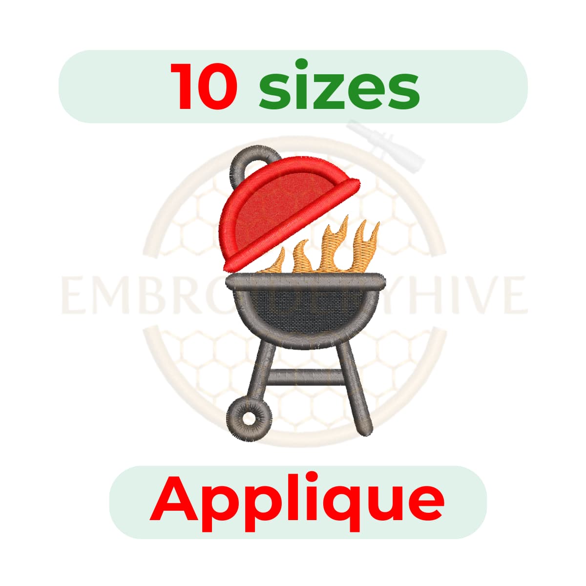 Barbecue applique embroidery design, 10 sizes from 3" to 7.5", ideal for aprons, kitchen décor, and BBQ-themed embroidery projects.