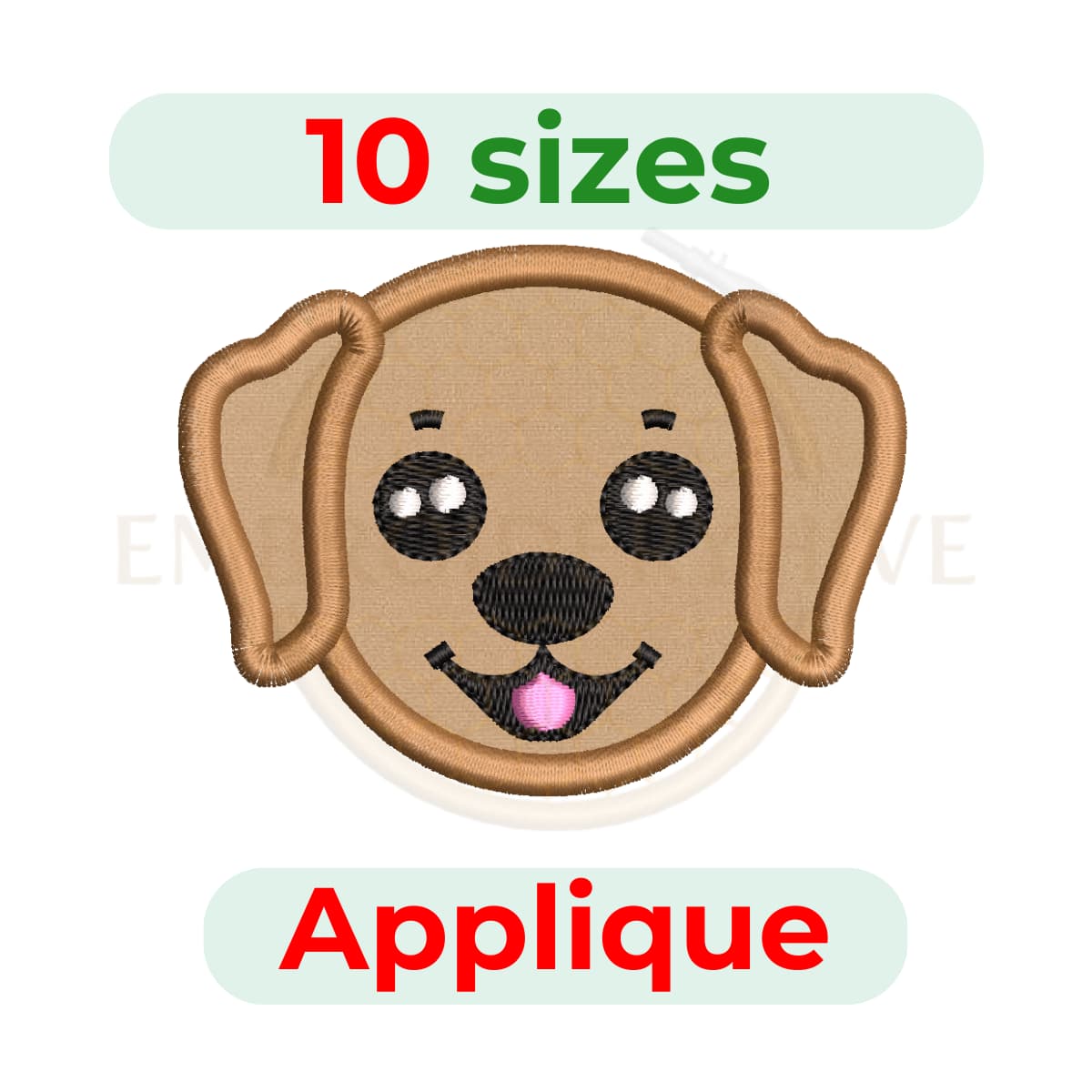 Cute dog face applique embroidery design, 10 sizes from 3" to 7.5" width, ideal for kids’ clothing, pet items, and fun embroidery projects.