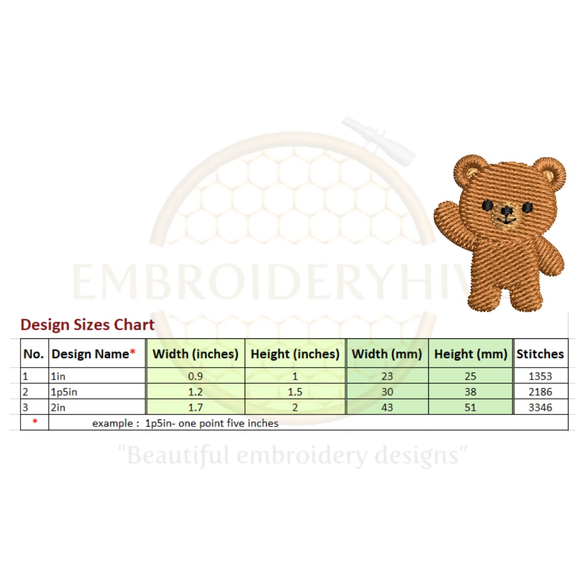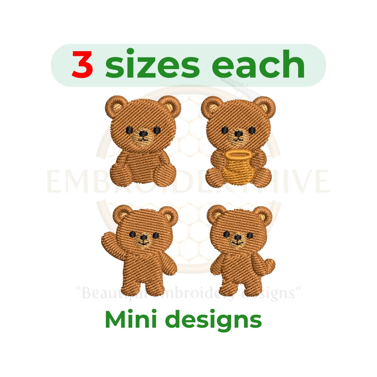 Baby bear mini embroidery design set with four cute bear designs — honey bear, sitting bear, walking bear, and waving bear — in 1–2 inch sizes for machine embroidery.