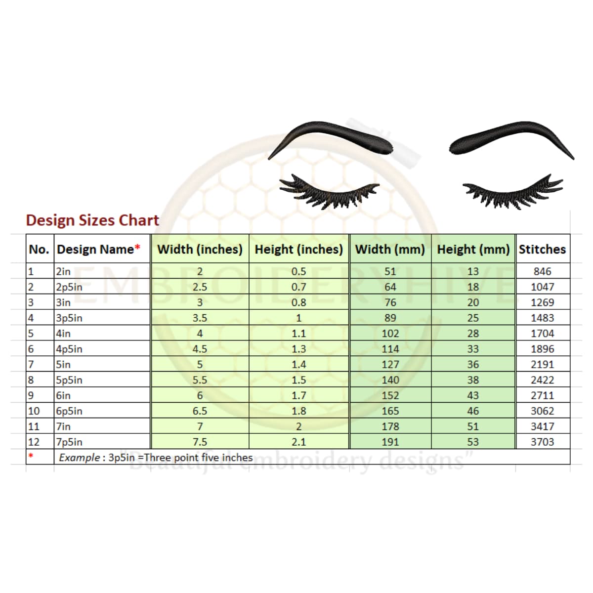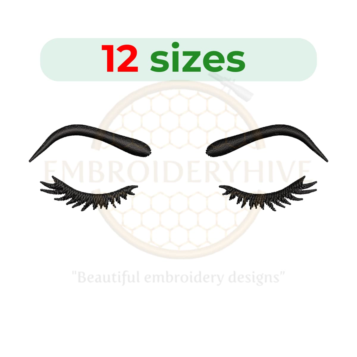 Embroidery design of woman's eyes with lashes, available in 12 sizes ranging from 2 to 7.5 inches in width, ideal for face and beauty embroidery projects.