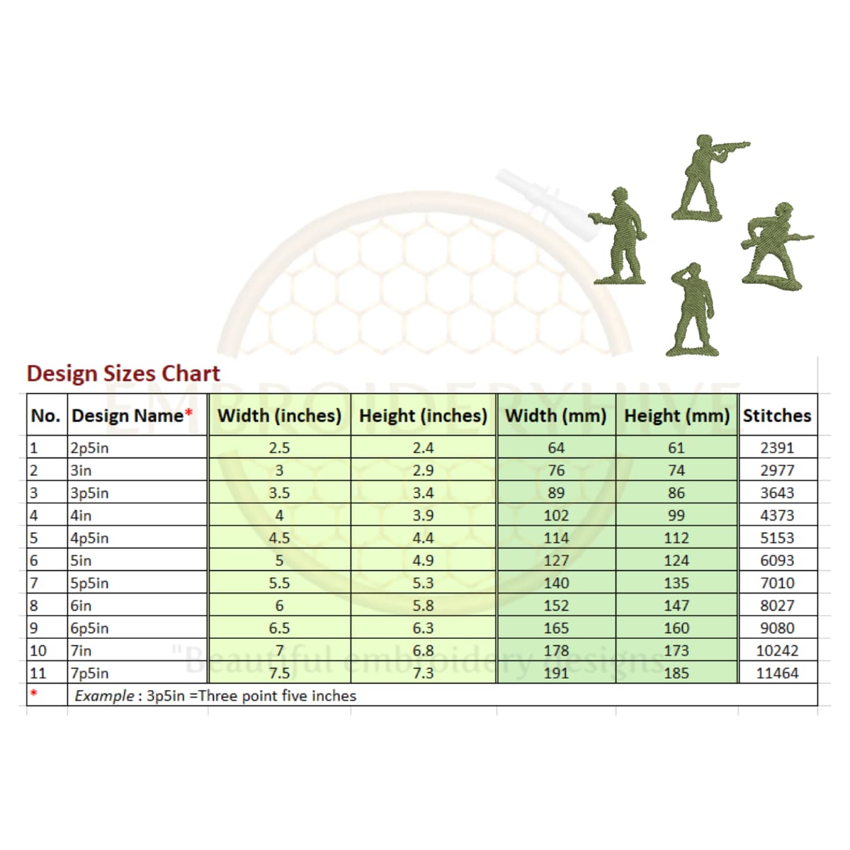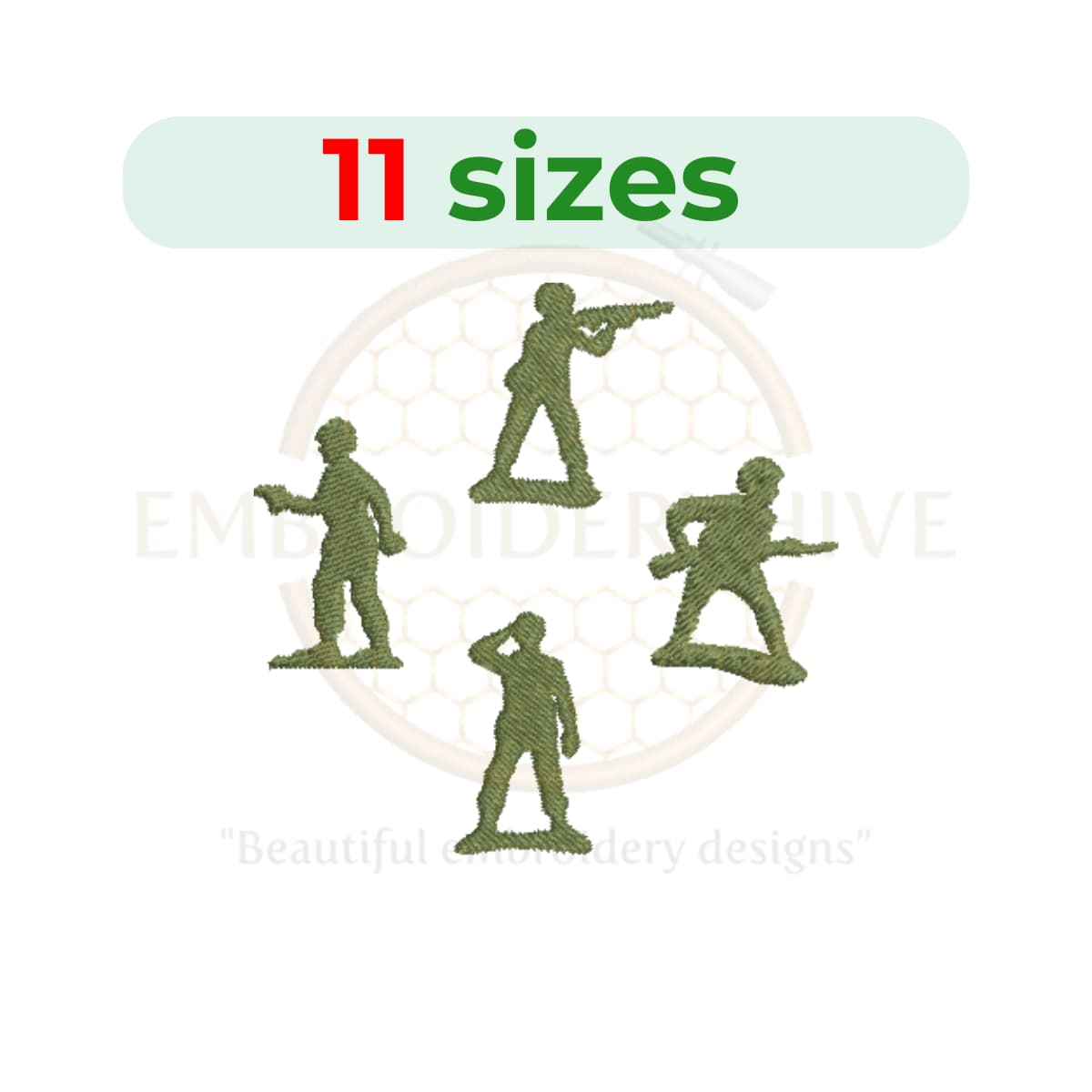 Green Army Machine Embroidery Design – mini green army silhouette pattern, ideal for toy, military, and creative embroidery projects. Available in sizes 2.5–7.5 inches, ready for instant download and compatible with popular embroidery machines.