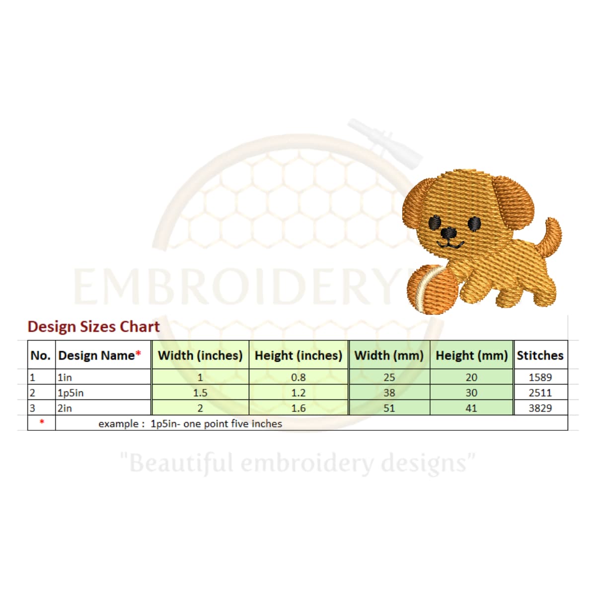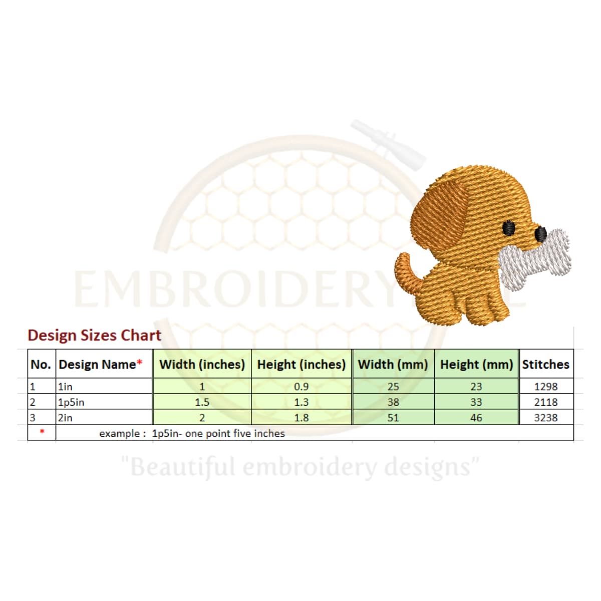 Baby Dog Mini Embroidery design set with four cute dog designs — ball dog, bone dog, happy dog, and sitting dog — in 1–2 inch sizes for machine embroidery.