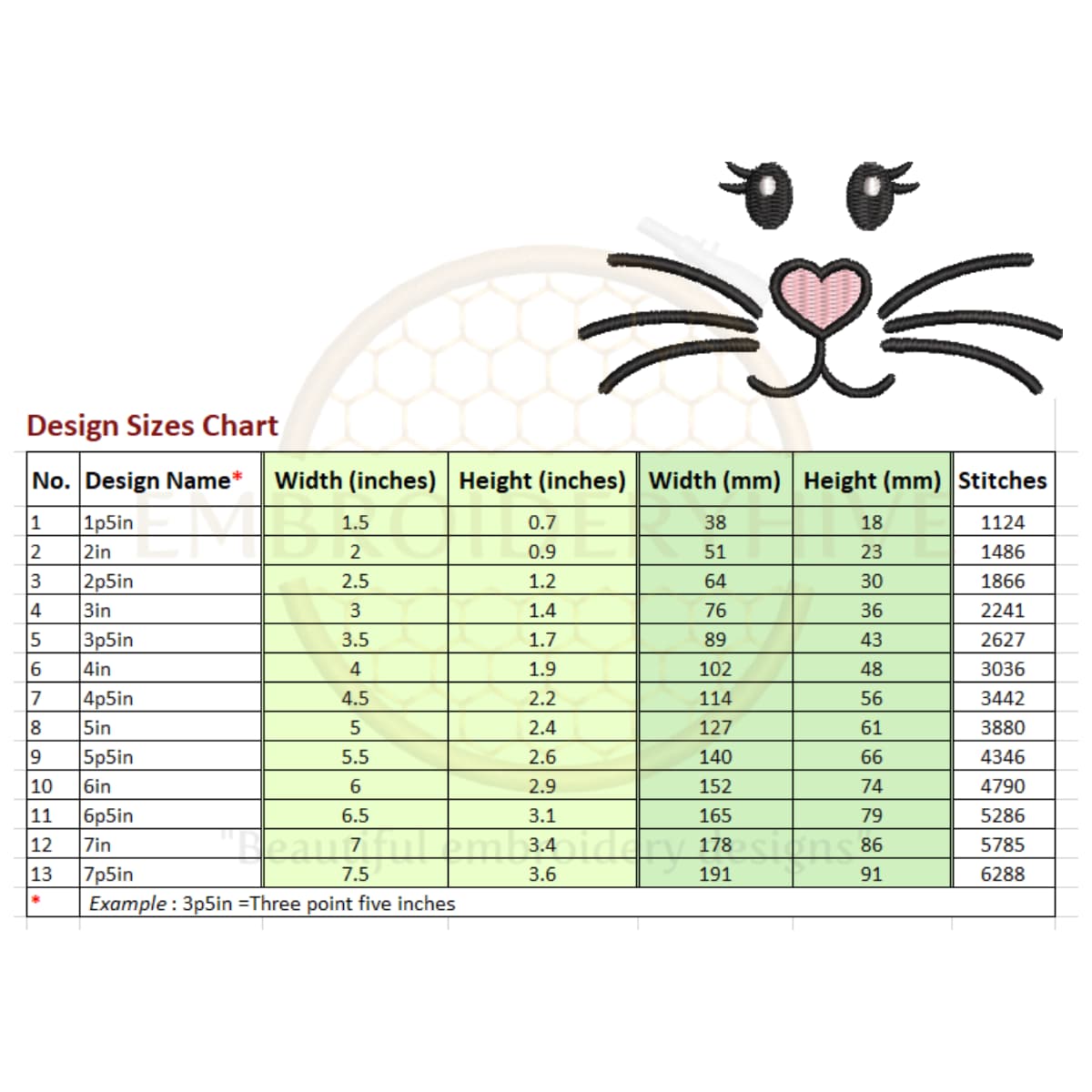 You will receive 13 sizes, ranging from 1.5 inches (38mm) to 7.5 inches (191mm) in width of each embroidery design, with each size increasing by 0.5 inches (12mm).
