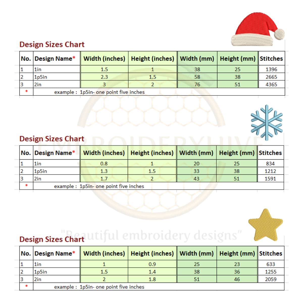 You will receive 3 sizes, ranging from 1 inches (25mm) to 2 inches (51mm) on each embroidery design, with each size increasing by 0.5 inches (12mm).
