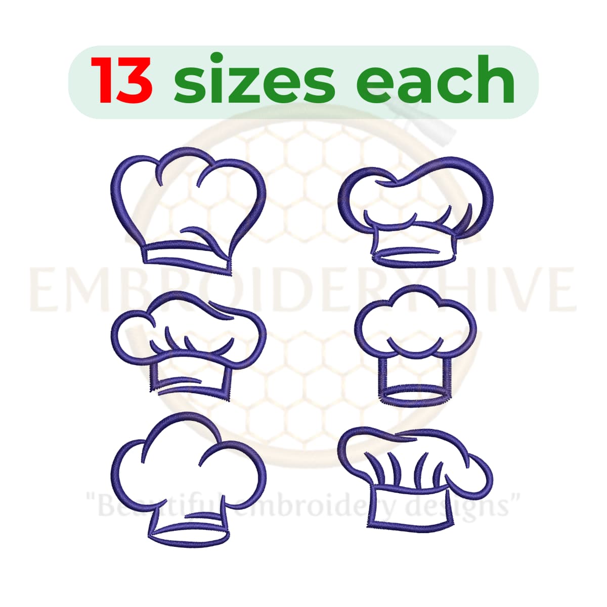 You’ll receive 13 sizes of each chef hat embroidery design, ranging from 1.5 inches (38mm) to 7.5 inches (191mm) in width, with each size increasing by 0.5 inches (12mm).