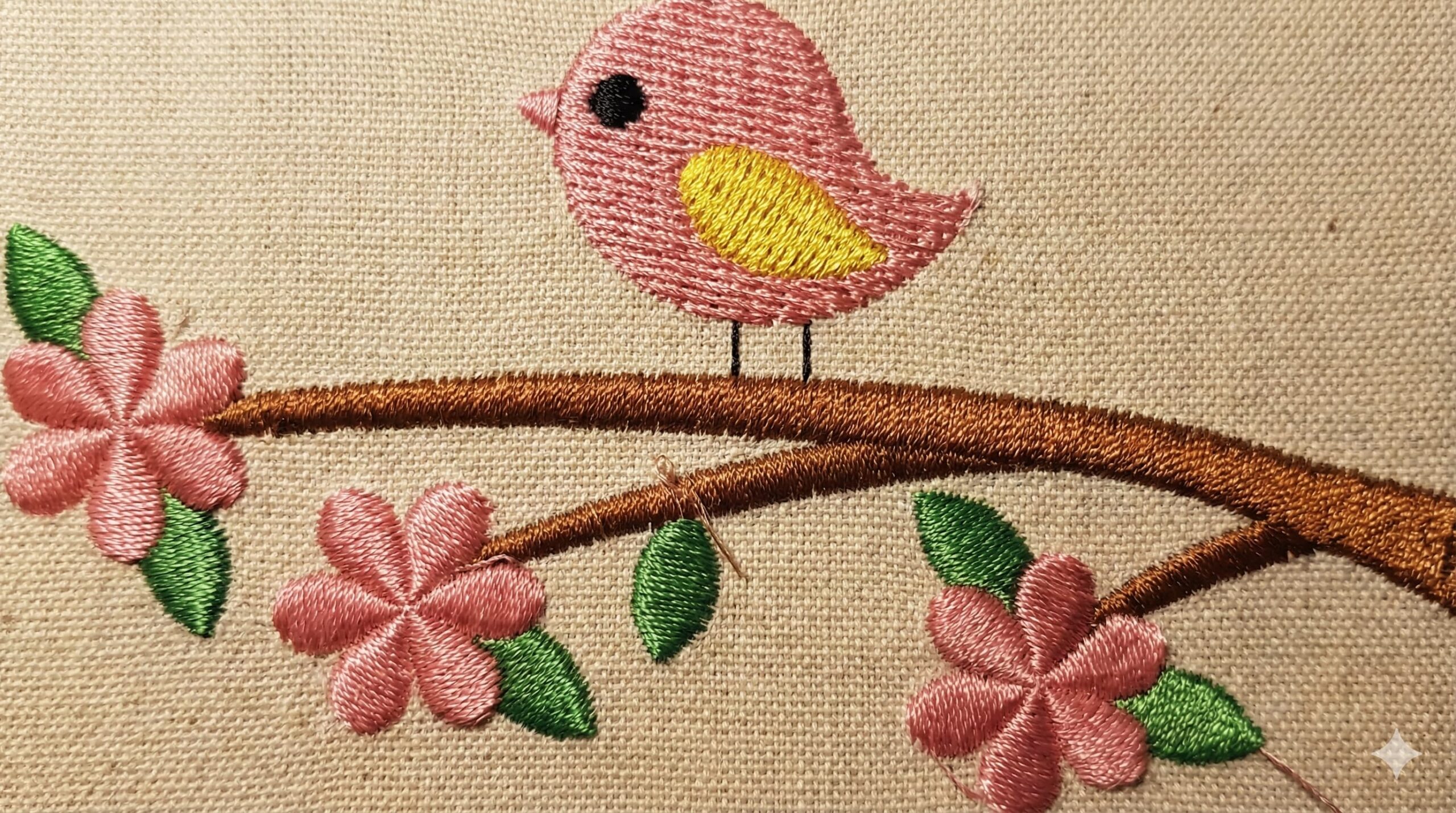 Mini bird on branch embroidery design, 2–7.5 inches. Silhouette filled stitch pattern, ideal for decorating clothing, quilts, accessories, and home décor. Instant digital download file ready for your embroidery machine.