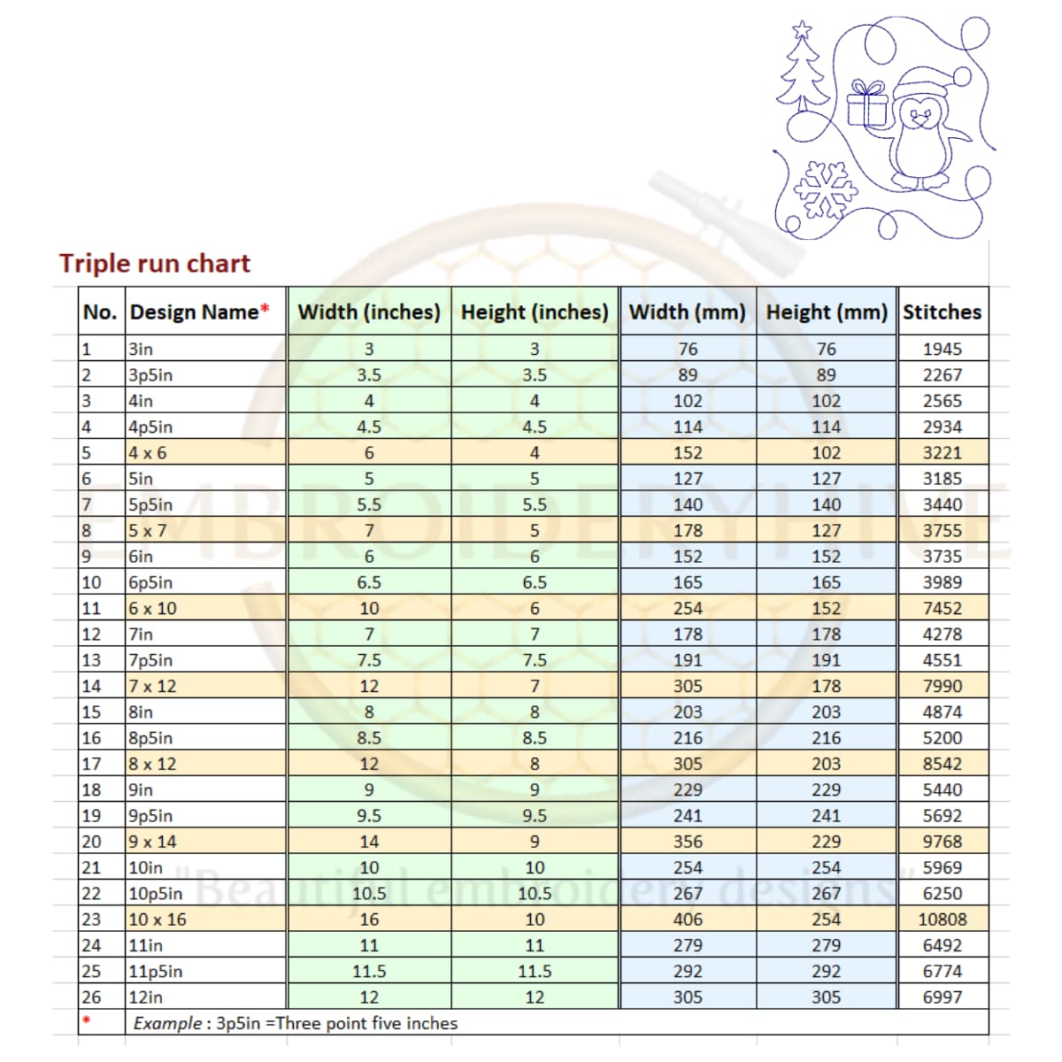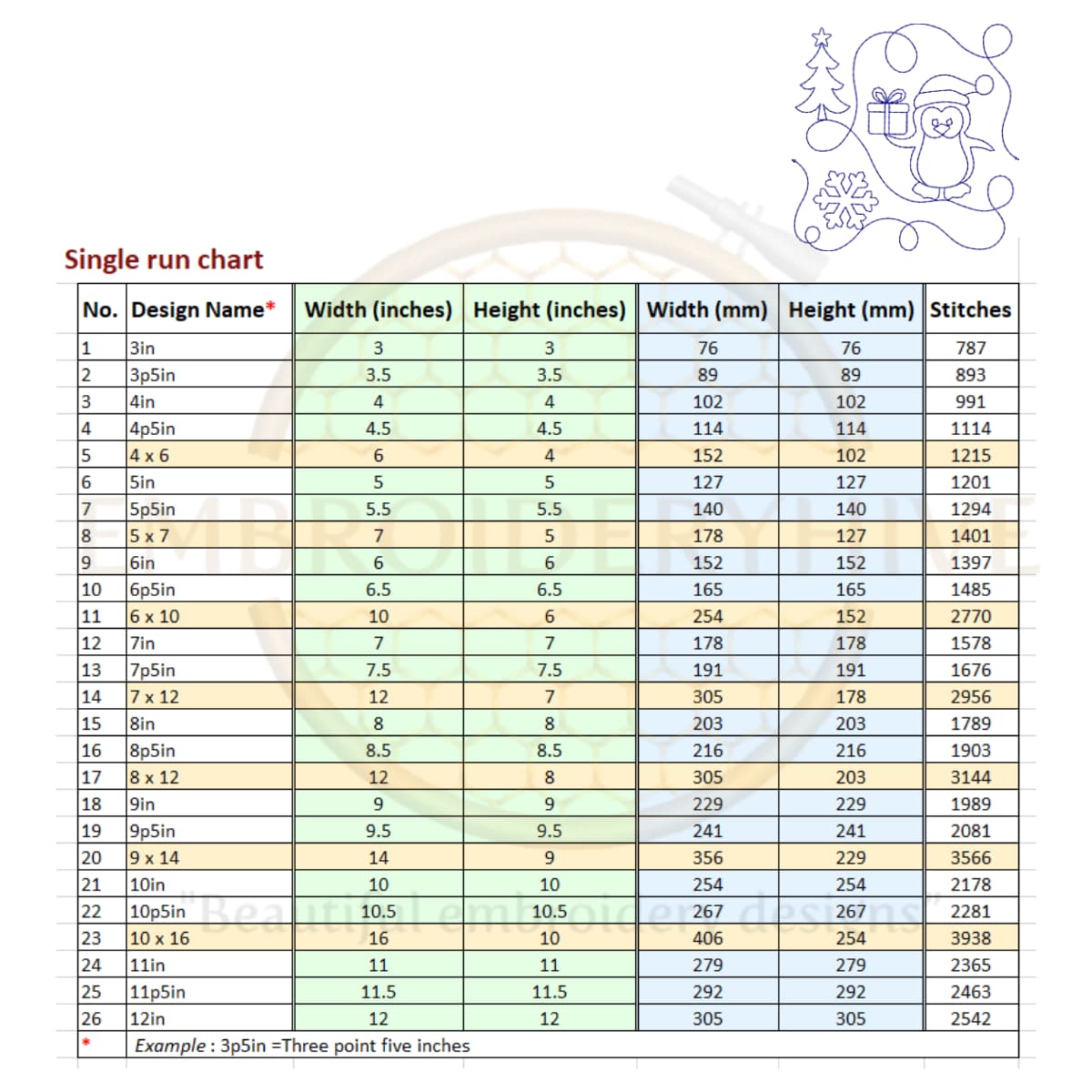 For 4×6 and 5×7 sizes, the design is stretched slightly to fit the rectangular shape. For larger sizes like 6×10, 7×12, 8×12, 9×14, and 10×16, two designs are joined together to fill the hoop completely.