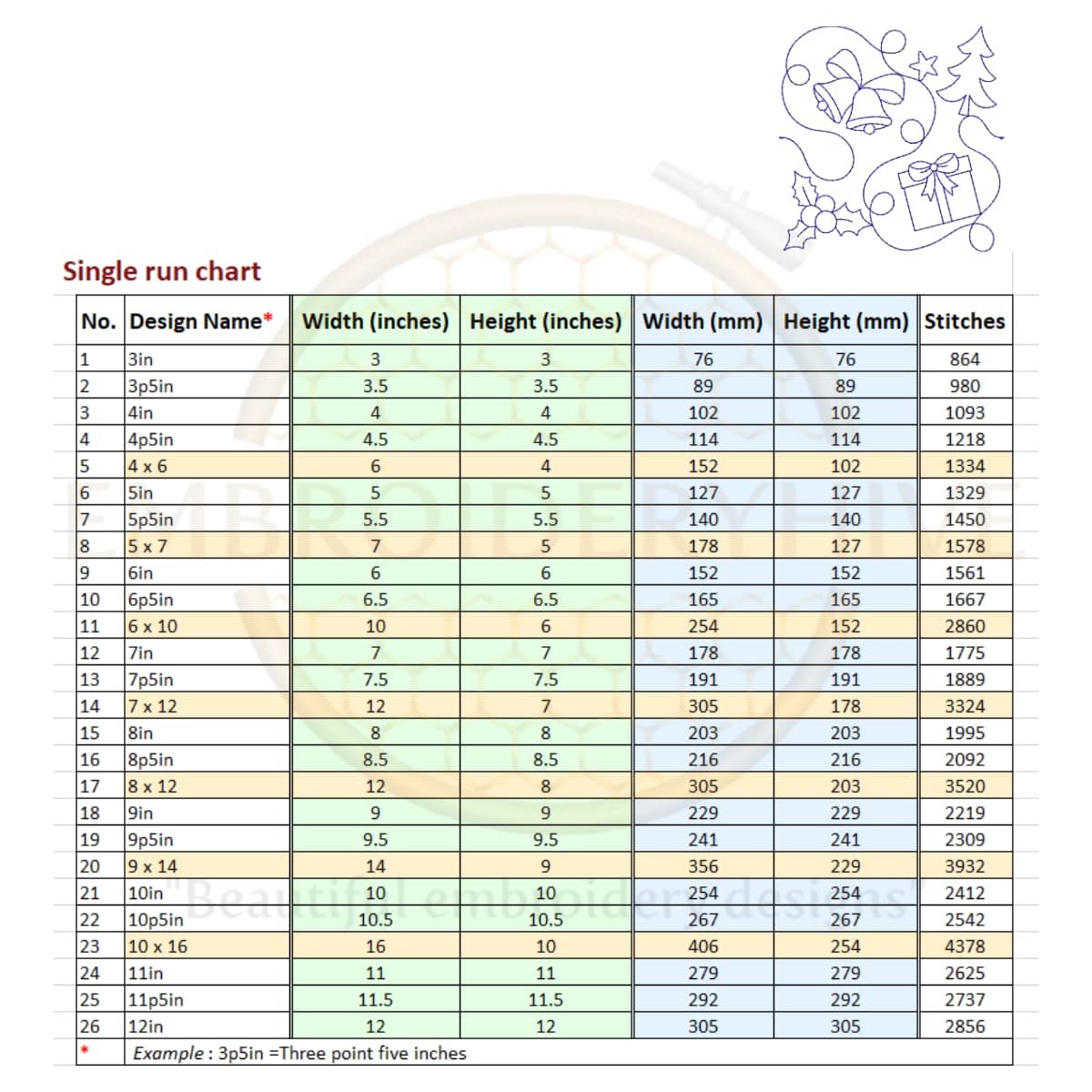 For 4×6 and 5×7 sizes, the design is stretched slightly to fit the rectangular shape. For larger sizes like 6×10, 7×12, 8×12, 9×14, and 10×16, two designs are joined together to fill the hoop completely.