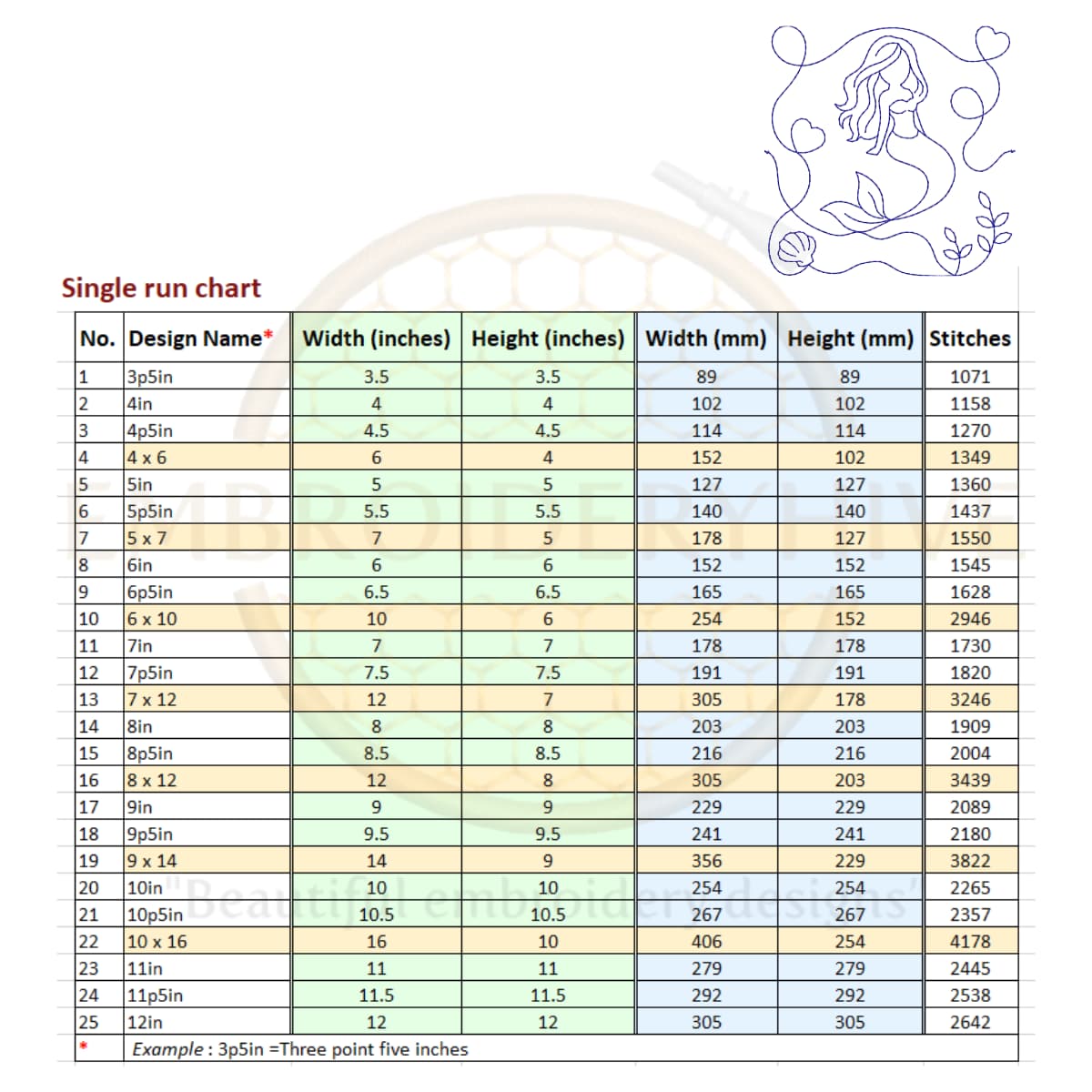For 4×6 and 5×7 sizes, the design is stretched slightly to fit the rectangular shape. For larger sizes like 6×10, 7×12, 8×12, 9×14, and 10×16, two designs are joined together to fill the hoop completely.