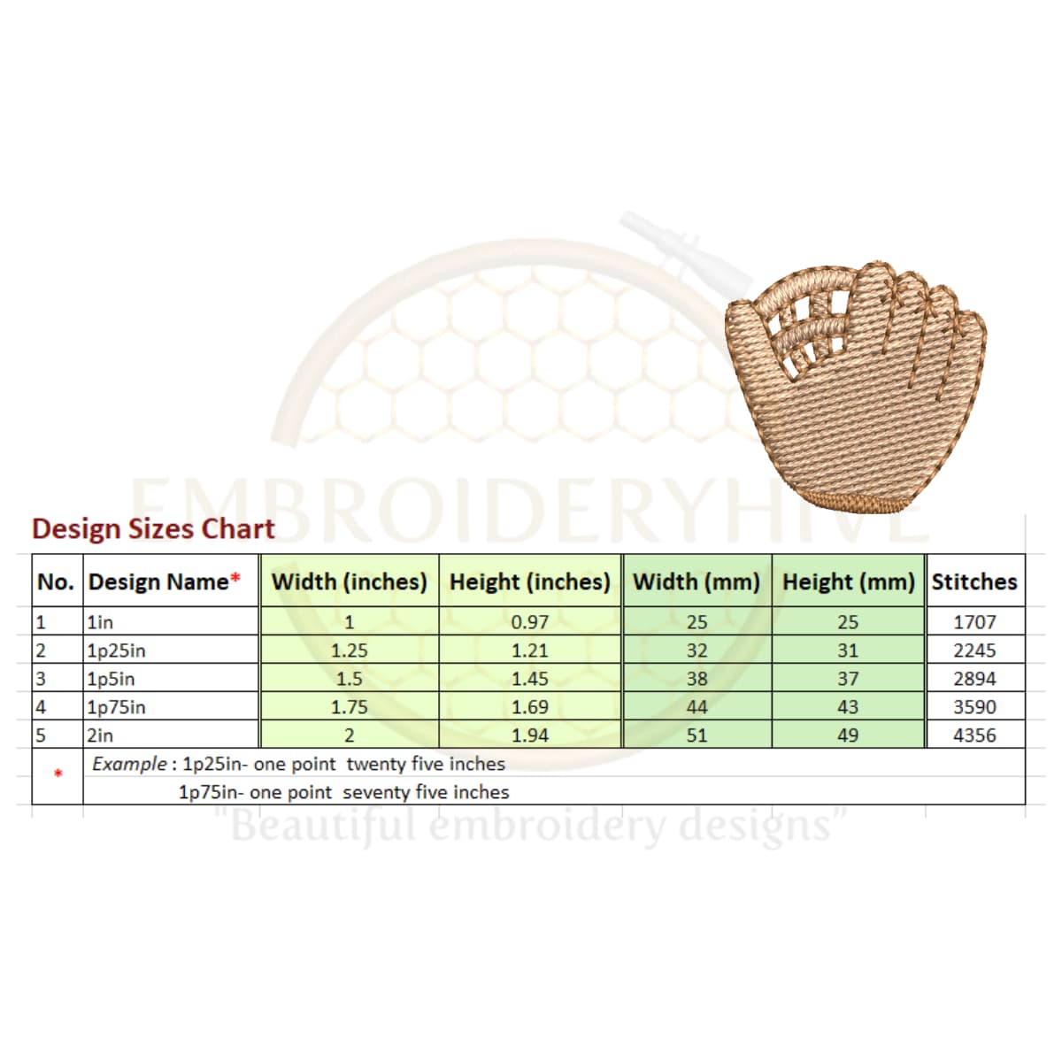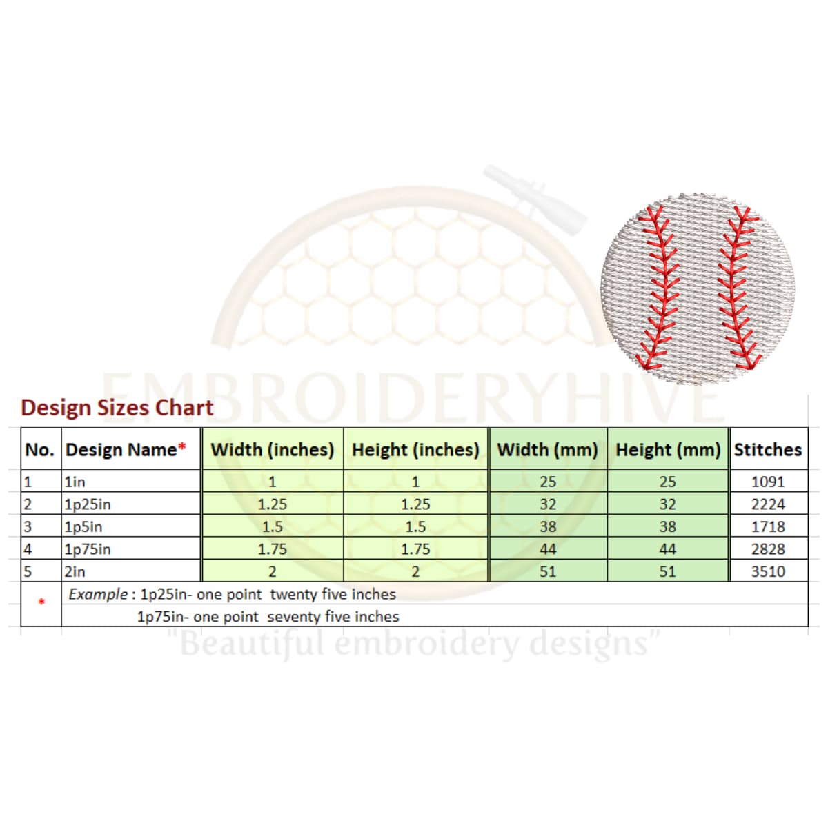 You will receive 5 sizes, ranging from 1 inches (25mm) to 2 inches (51mm) in each embroidery design, with each size increasing by 0.25 inches (6mm).