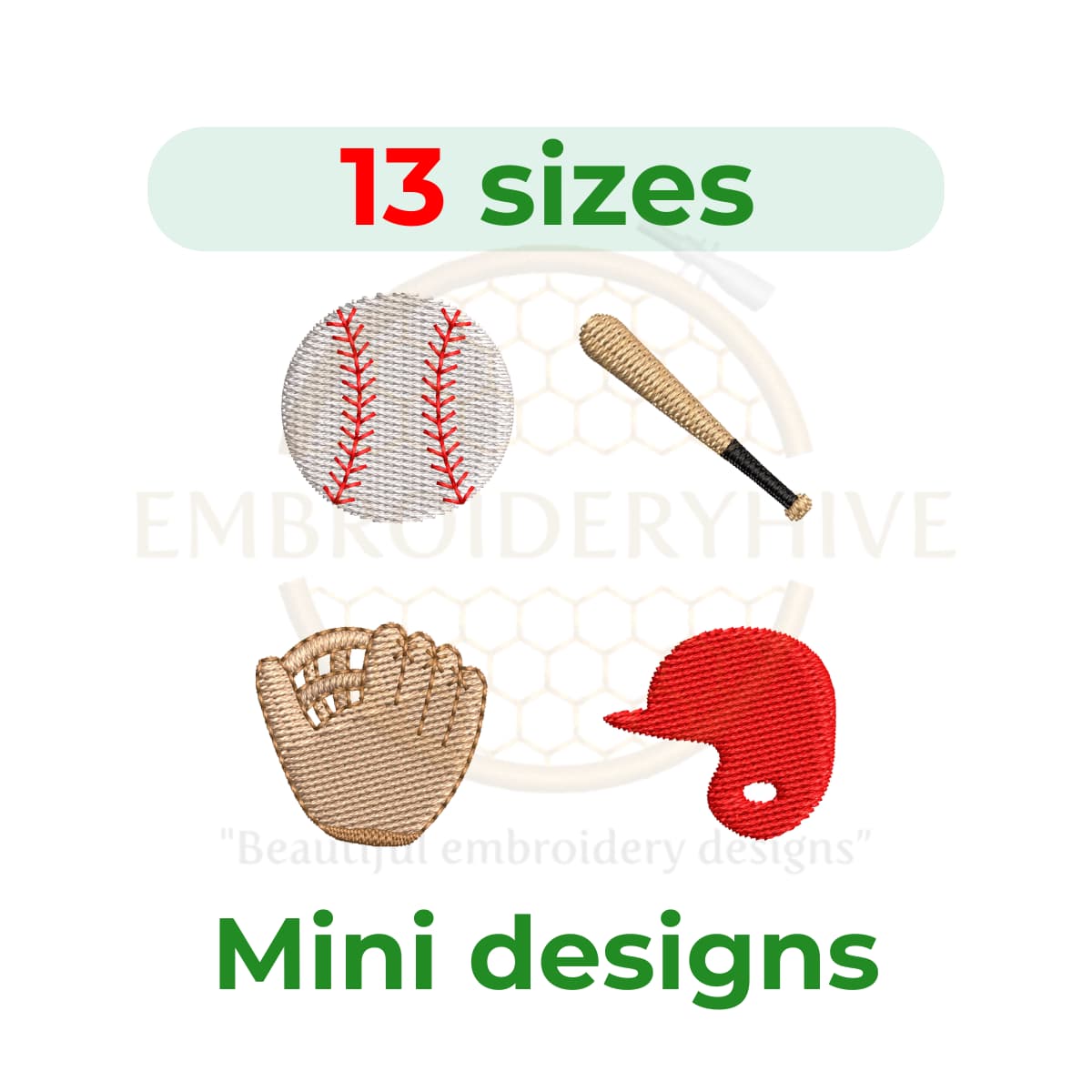 Mini Baseball Machine Embroidery Design Set – Baseball, Bat, Glove & Helmet, 1–2 inch. This instant download set features small, sporty designs ideal for adding a baseball touch to clothing, accessories, and craft projects for sports enthusiasts.